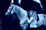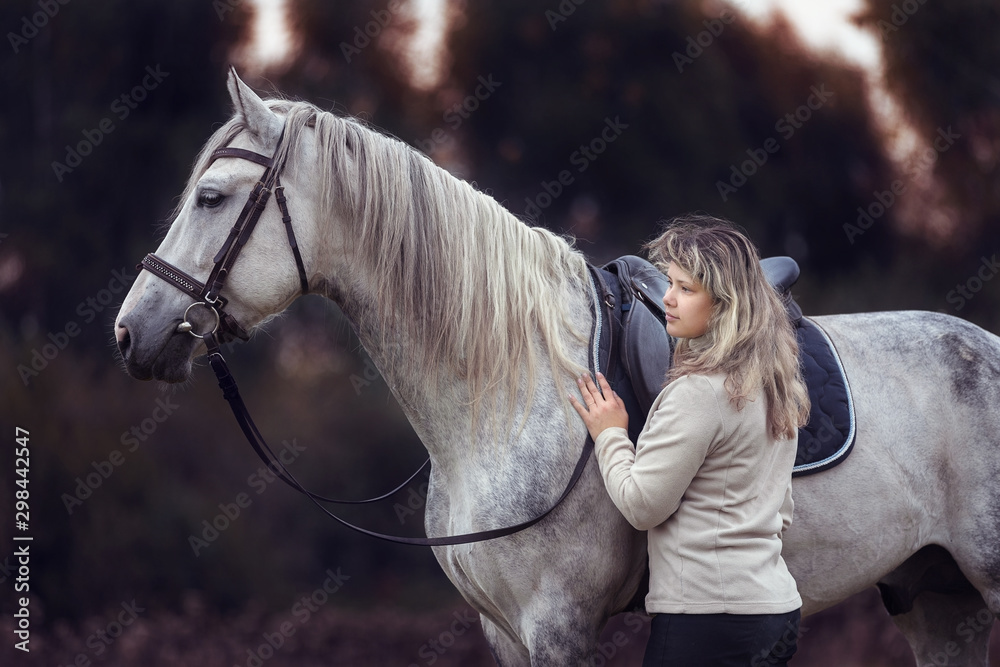 Beautiful girl posing with a purebred arabian horse outdoors.