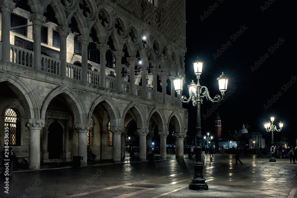 Venice at night, Italy. Doge`s Palace or Palazzo Ducale on St Mark`s square in the Venice city center. San Marco is a main tourist attraction of Venice. Renaissance architecture of old Venice.