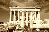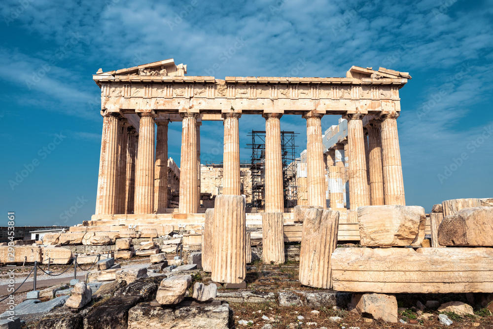 Ancient Parthenon temple on Acropolis, Athens, Greece. It is top landmark of Athens. Facade of famous Parthenon in Athens city center. Scenery of Greek ruins, remains of classical Athenian culture.