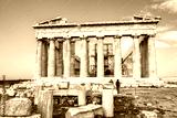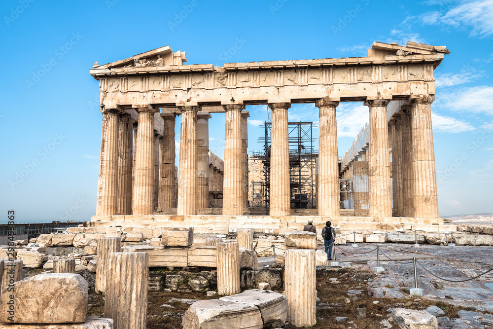 Parthenon on Acropolis hill, Athens, Greece. It is a top landmark of Athens. Ancient Greek ruins in Athens center in summer. Tourists look at the famous temple, remains of classical Athenian culture.