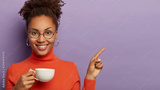 Adorable curly haired woman with tender smile, relaxes with drink in white mug, points on copy space, enjoys refreshing coffee, wears optical glasses and turtleneck, stands against purple background