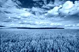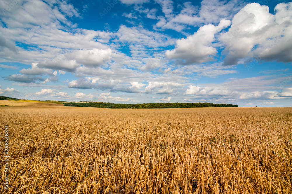 field of wheat under beautiful blue cloudy sky