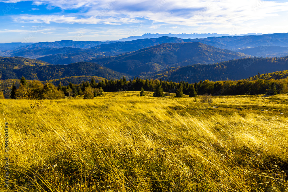 Bright yellow tall grass against the background of autumn mountains and a blue sky, Ukraine travel concept