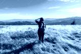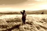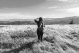 A girl in a jacket with a hood and a backpack looks into the distance at the panorama of autumn mountains, the concept of autumn travelling