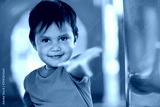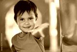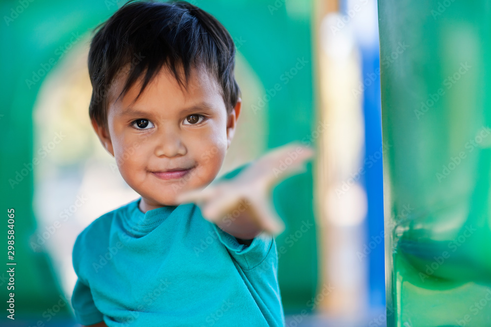 A latino boy of three years of age extends his hand out as a friendly gesture while in a kids playground.