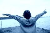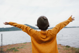 Asian little girl stood looking at the river in the embankment while raising her hand up in the morning winter.