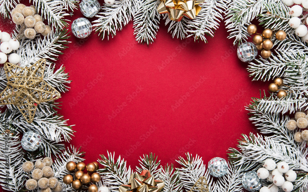 Merry Christmas and Happy Holidays greeting card, frame, banner. New Year. Noel. Silver, white and red Christmas ornaments and fir tree on red background top view. Winter holiday xmas theme. Flat lay.