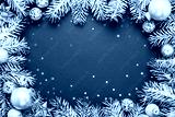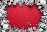 Merry Christmas and Happy Holidays greeting card, frame, banner. New Year. Noel. Silver, white and red Christmas ornaments and fir tree on red background top view. Winter holiday xmas theme. Flat lay.