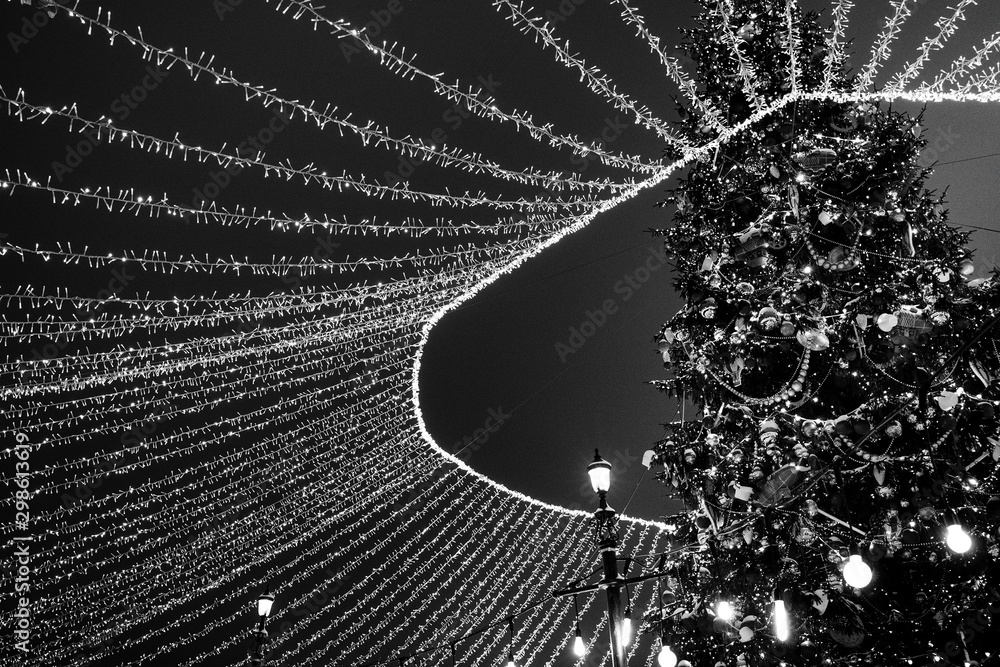 Romantic fairytale Christmas festive tree decorated with a garland gifts evening park winter landscape. Xmas spruce light chains decoration street lights dark sky. Retro postcards film noise effect