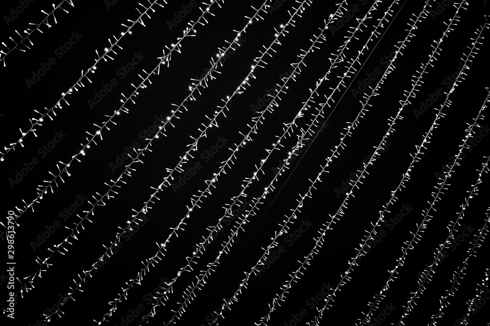 Electric light chain garland on dark background. Thousand small light bulbs, festive garland illuminate night sky.