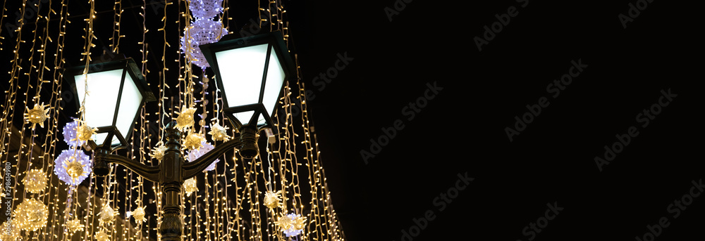 Romantic fairytale festive street decorated with a garland. Antique lanterns light chains decoration old town illuminated night scene. Retro style holidays postcard poster. copy space on black