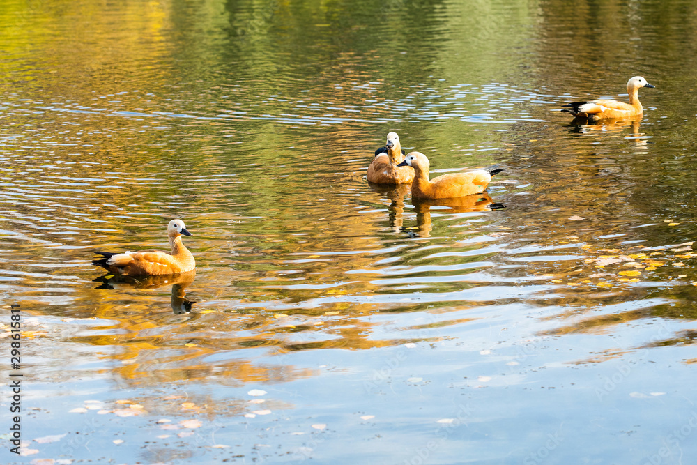 Ruddy Shelduck ducks swims in a river. The surface of the river with reflections autumn forest leaves and bright autumn colorful overflows