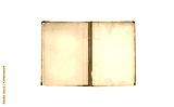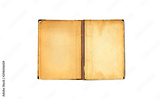 Vintage book spread with empty pages on white background. Open blank notebook with aged textured paper sheets macro view. Copy space