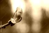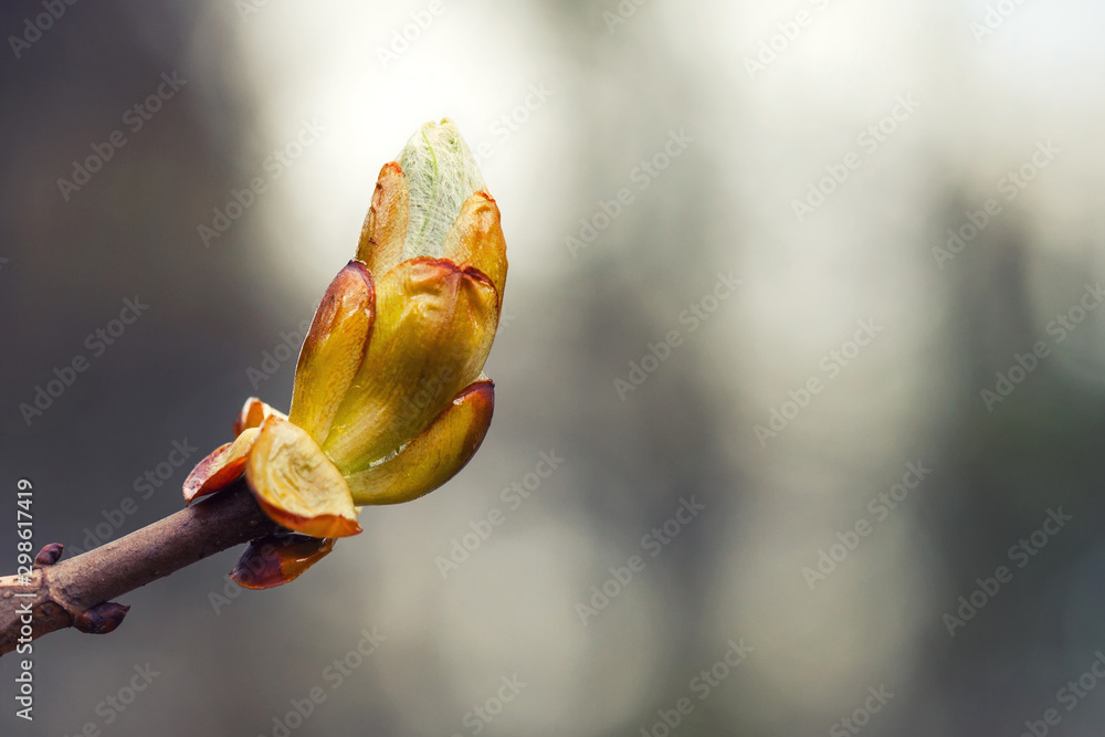 New life spring time concept. Horse chestnut bud macro view. Shallow depth of field, soft focus background, copy space