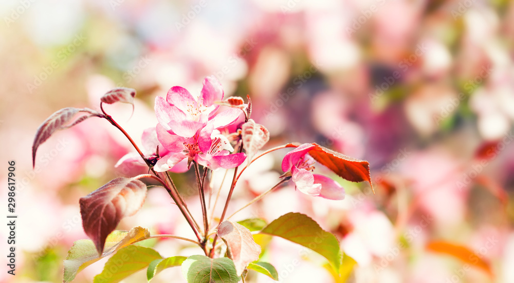 Spring season warm sunny floral wallpaper. Fruit tree branch with fresh blooming buds of delicate pink flowers on blurred background. Soft focus macro view photo