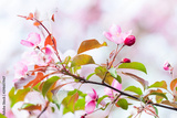Festive springtime romantic background. Flowering Japanese-style purple color garden. brightly blossoming fruit tree with pink petals.