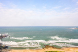 Aerial view of sandy beach with tourists swimming in beautiful clear sea water