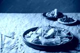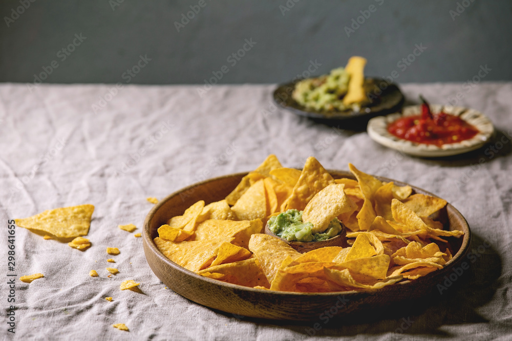 Tortilla nachos corn chips with avocado guacamole and tomato sauce served in wood plate on linen table cloth. Mexican snack