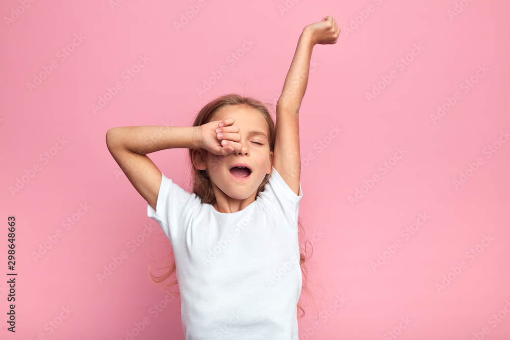 cute girl child with long blond hair yawns sweetly, stretching her arms, kid wants to sleep, isolated pink backround, tiredness. close up portrait