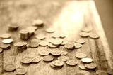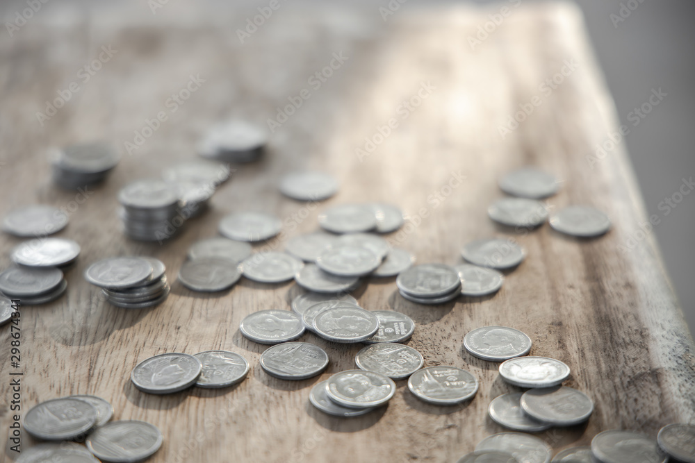 Thai baht money or Money Thai coins staircase sorted on wooden table. King of Thailand. The concept of financial planning, savings, Business successful