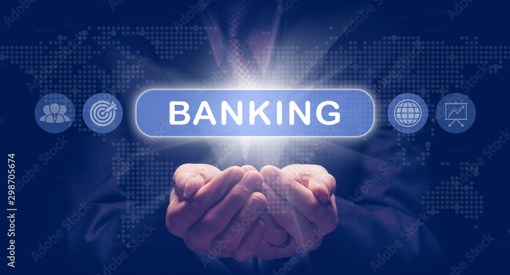 Businessmans cupped hands holding a Banking business concept on a computerised display.