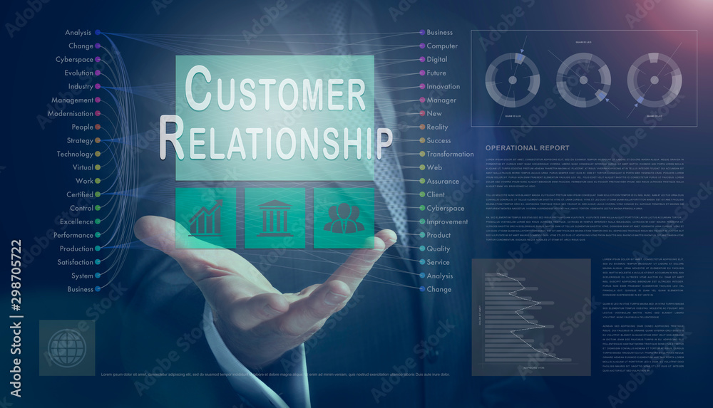 Businessman outreached hand holding a Customer Relationship business concept on a computerised screen display.