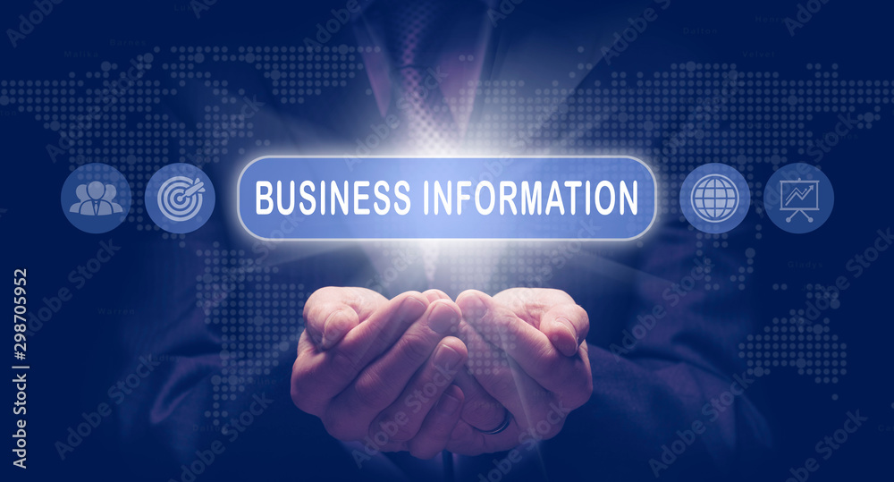 Businessmans cupped hands holding a Business Information business concept on a computerised display.