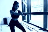 Attractive cross fit female do fitness exercises in gym with window background. Dressed in black leggins, topic and white sneakers.