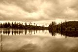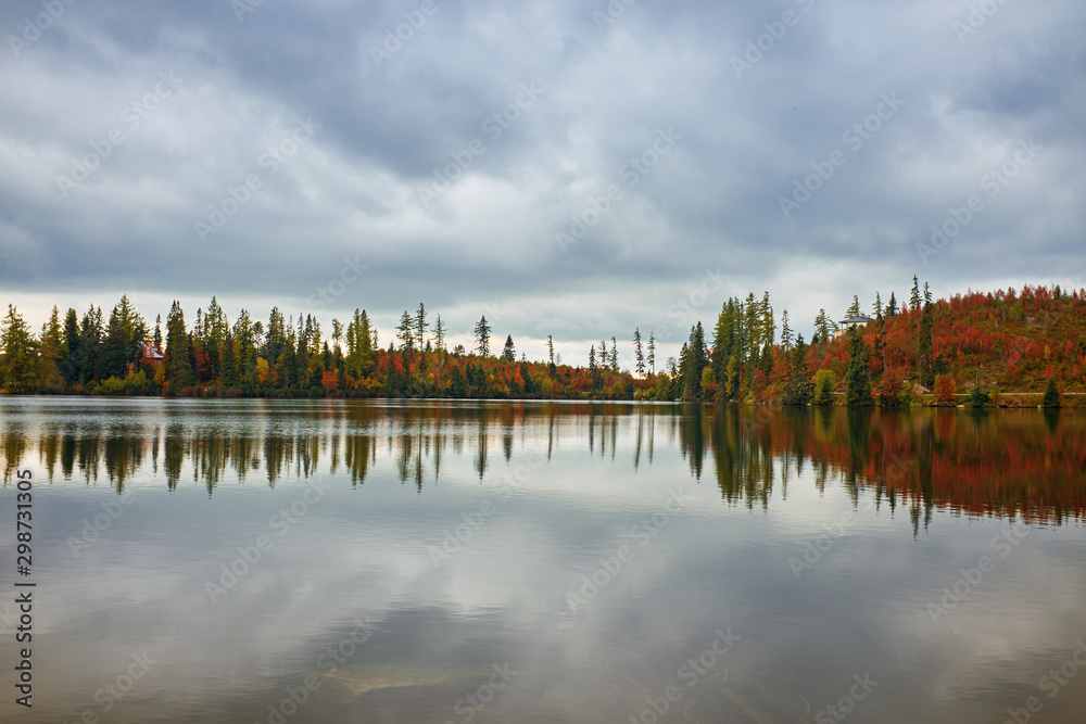 Beautiful reflection of a colorful autumn park on wate - Strbske pleso lake in High Tatras mountain, Slovakia