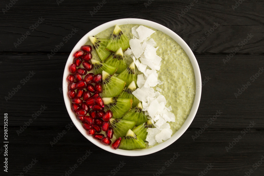 Pudding with chia, matcha tea, kiwi, pomegranate seeds and coconut flakes in the white bowl in the center of the black wooden background. Top view. Copy space.