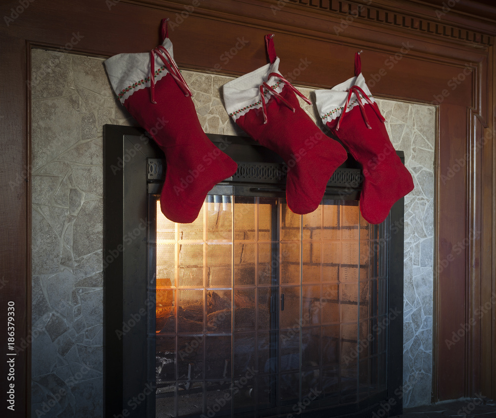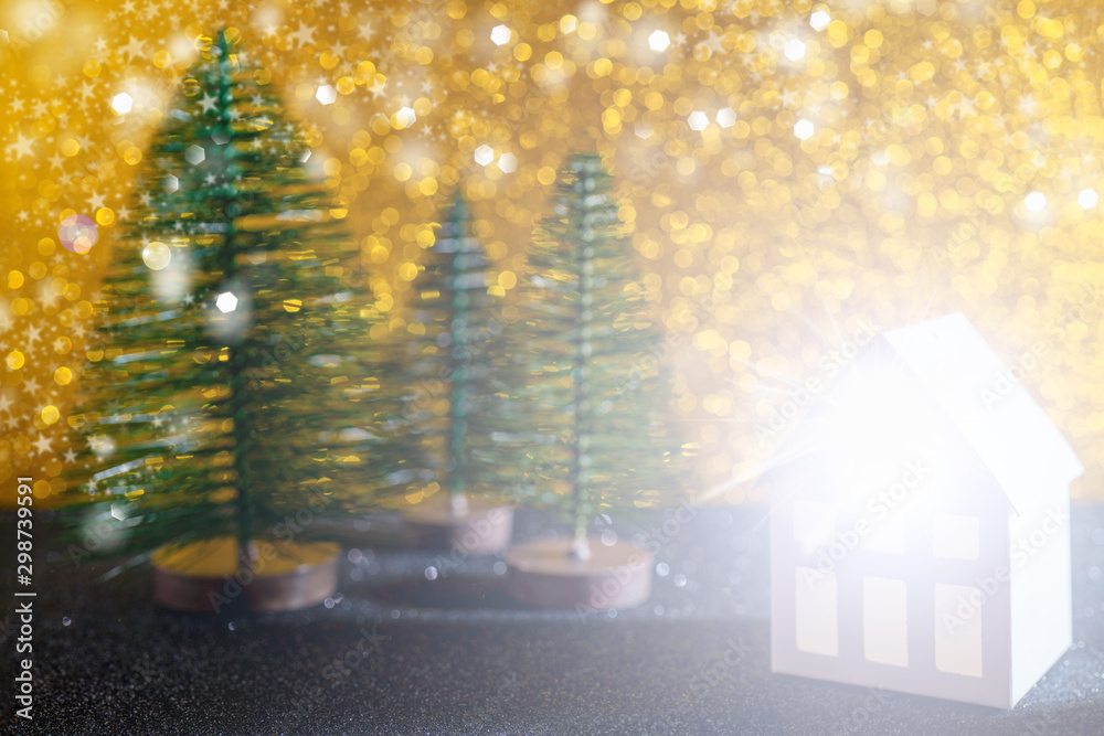 Green christmas tree on shiny background. Beautiful bokeh. Little white house.