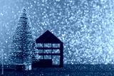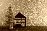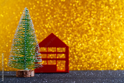 Green christmas tree on shiny background. Beautiful bokeh. Little red house.