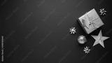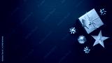 Merry Christmas and Happy Holidays greeting card, frame, banner. New Year. Noel. Christmas ornaments and gift on blue background top view. Winter xmas holiday theme. Flat lay