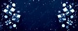 Merry Christmas and Happy Holidays greeting card, frame, banner. New Year. Noel. Christmas ornaments and gift on blue background top view. Winter xmas holiday theme. Flat lay