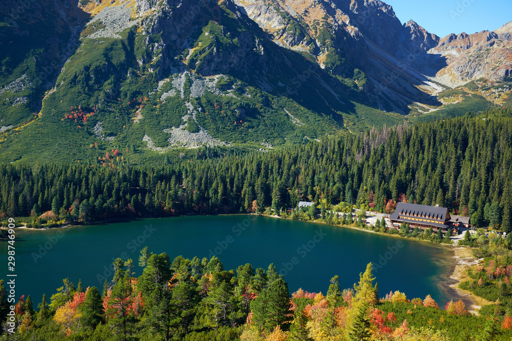 Poprad Lake with autumn pine forests from the red hiking trail of the Ostrva mountain in High Tatras National Park, Slovakia
