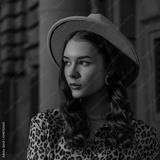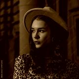 Outdoor close up fashion portrait of young elegant lady wearing beige fedora hat, trendy chain necklace, earrings, leopard print shirt, posing at sunset, in street of European city. Copy space