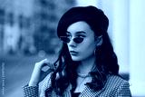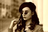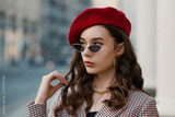 Outdoor close up fashion portrait of young elegant luxury lady wearing red beret, trendy sunglasses, houndstooth print autumn coat, posing in street of European city. Copy, empty space for text