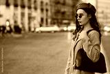 Outdoor fashion portrait of young elegant luxury woman wearing houndstooth print autumn coat, trendy sunglasses, beret, holding reptile textured red bag, walking in street of city. Copy, empty space