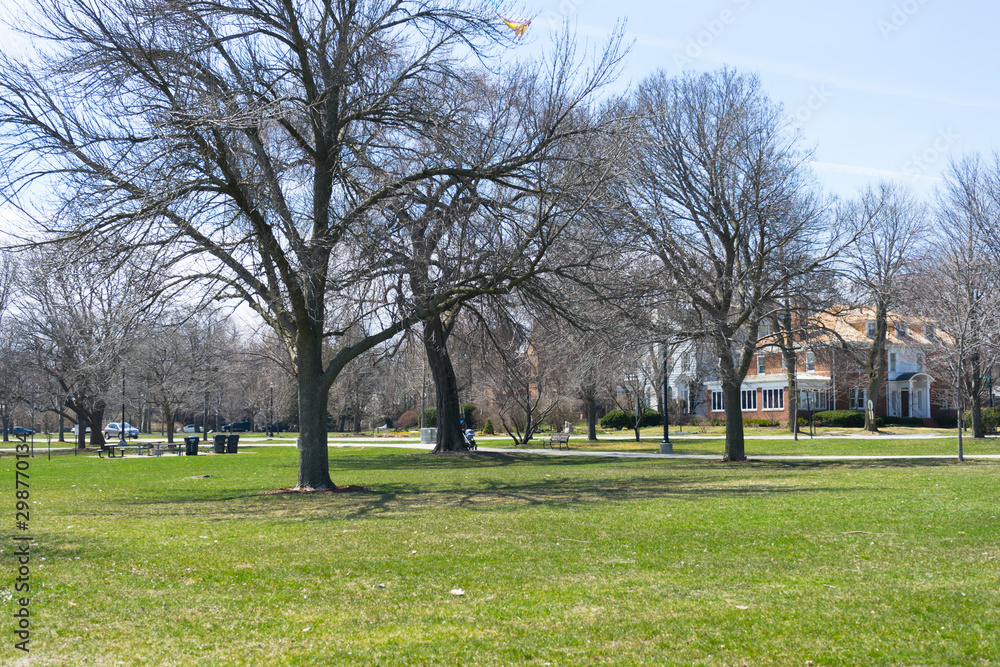 Chicago beautiful park by lake Michigan, spring landscape of green field