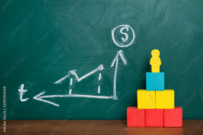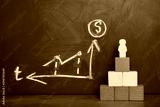 Man figurine stands on top of pedestal near blackboard on which graph is drawn. Concept leadership