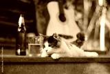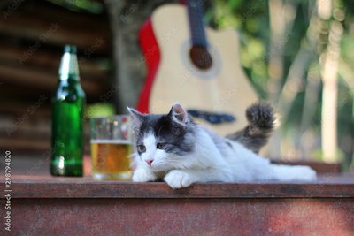 Beautiful cat sitting lonely on the balcony with a glass of beer and guitar background.