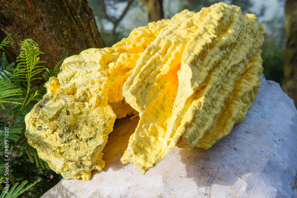 Pieces of raw Sulphur/Sulfur after mining from Kawah Ijen, a volcano in East Java, Indonesia. Sulphur is important to used in many other industries.