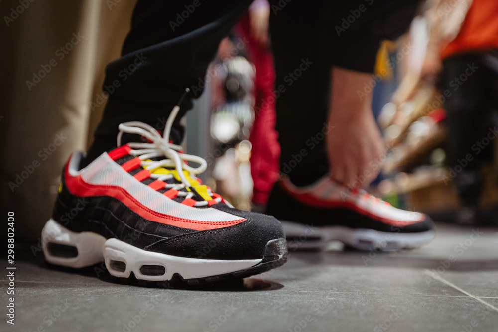 Side view of bright sneakers with black and red stripes on crop person bending to tie shoelaces on floor