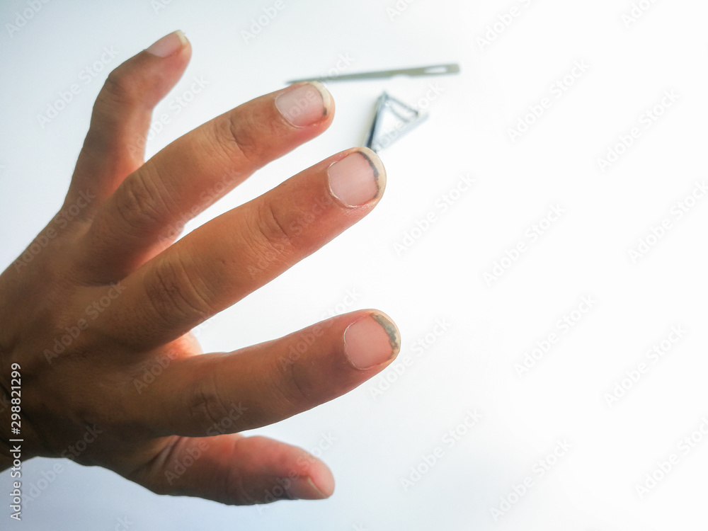 Man's hands with dirty nail using nail clipper for fingernails manicure isolated on white background