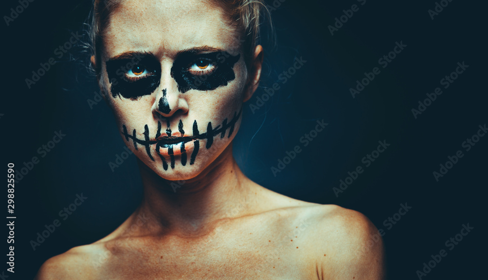 Portrait of woman with Halloween skull make up. Horror spooky skeleton visage concept