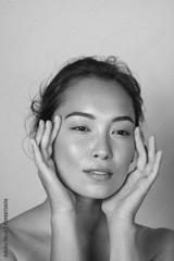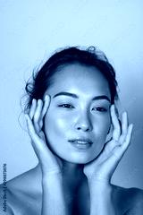 Skin care. Woman with beauty face and healthy facial skin portrait. Beautiful asian girl model with natural makeup touching glowing hydrated skin on blue background closeup. High quality image