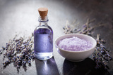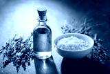 Glass bottle of lavender essential oil and purple bath salt with dried lavender flowers