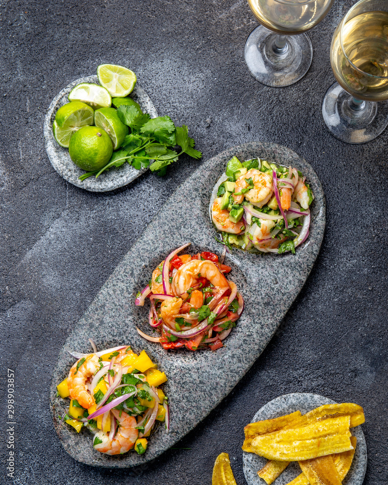 CEVICHE. Three colorful shrimps ceviche with mango, avocado and tomatoes. Latin American Mexican Peruvian Ecuadorian food. Served with white wine and banana chips