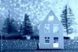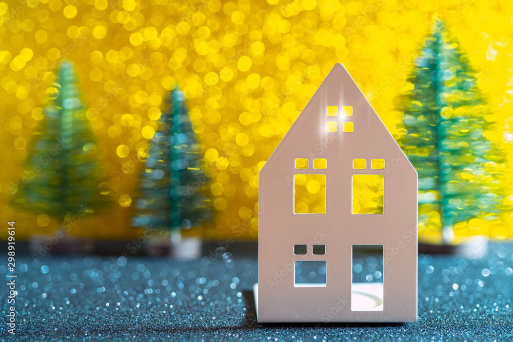 Green christmas tree on shiny background. Beautiful bokeh. Little white house.