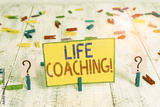 Text sign showing Life Coaching. Business photo text demonstrating employed to help showing attain their goals in career Scribbled and crumbling sheet with paper clips placed on the wooden table